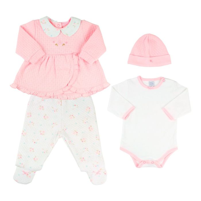El vestido-tunicón rosa está confeccionado con una suave textura acolchada que es perfecta para la delicada piel de tu bebé. Su cuello "Peter Pan" blanco con bordado floral y el acabado de volantes en el dobladillo le dan un toque muy dulce y coqueto. El pantalón con pies, de base blanca y un delicado estampado floral en tonos pastel, garantiza que los deditos de tu bebé se mantengan calentitos sin necesidad de calcetines que se puedan caer.