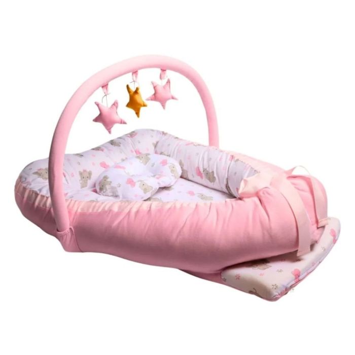 | Beneficios | Puede utilizarse para el descanso del bebé como colecho y para estimularlo con juguetes en el arco, favorece la lactancia materna, cuenta con colgadores para colocar los juguetitos, se puede utilizar como colecho para dormir junto a él, arco desmontable para hora de dormir, regulable, bordes de seguridad, almohadita anti cabeza plana, material amigable con la piel, hecha de algodón. |